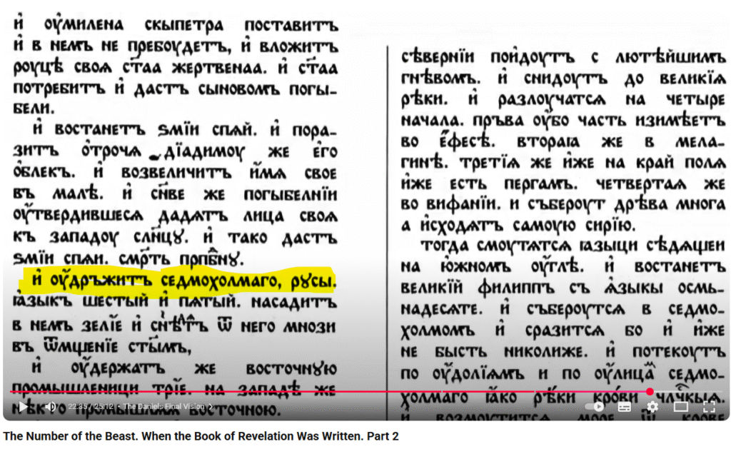 The Daniel’s Final Vision did not make it into any modern biblical canons and had never been published until recently. The reason is that it clearly contradicts the contemporary chronology in many places. After all, Daniel is considered an Old Testament prophet who supposedly lived long before the birth of Christ. But how can we understand the fact that the geographical names used in his prophecy are purely medieval? The rite of baptism is even mentioned. All of this unequivocally places Daniel’s Old Testament prophecy in the medieval Christian era. However, the Scaligerian chronology is incapable of accommodating such a shift. It crumbles under its weight.