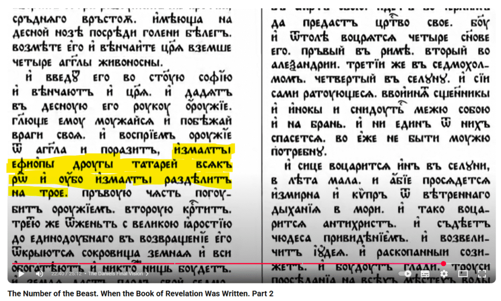 The Daniel’s final vision was transcribed by hand by Gleb Nosovsky in the reading room of the manuscript department in 1992. in this Old Testament prophecy, medieval European nations are directly named Russians, Tatars, and Ishmaelites. The Ishmaelites and the Ethiopians are refered to as Tatars. Furthermore, there is explicit mention of the Christian rite of baptism. The well-known medieval city of Thessaloniki, or Salonika, is also refered to. Towards the end of the prophesy, distinctly Christian expression are used, including a mention of the Antichrist. On other hand, it’s worth reiterating that this text is attributed to the Old Testament prophet Daniel, who supposedly lived in a Pre-Christian era, long before the beginning of the Common Era [a calendar system that begins in the year 1, which is traditionally considered the year of the birth of Jesus Christ].